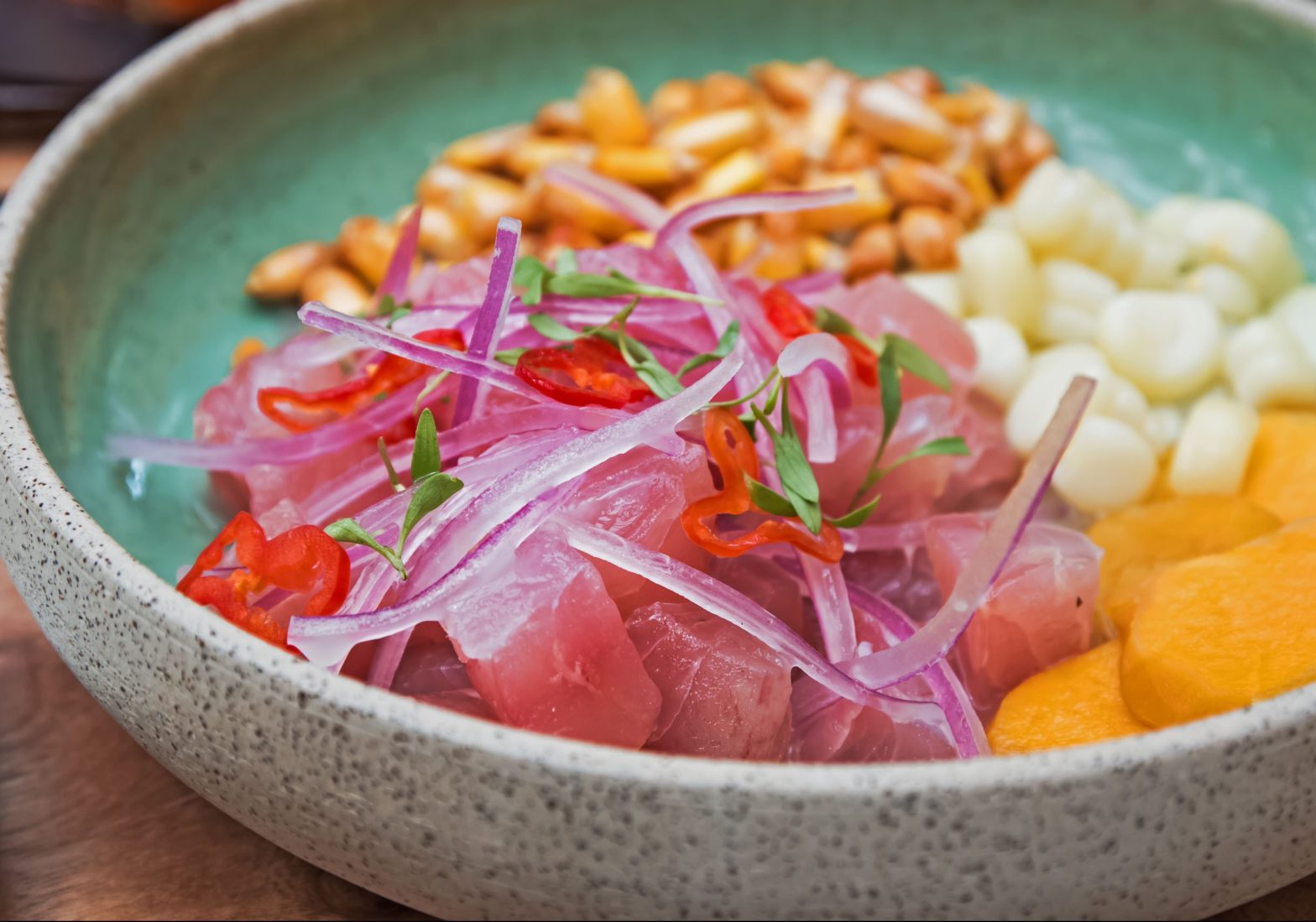 Ceviche ist in der lateinamerikanischen Welt ein weit verbreitetes Gericht. Ursprünglich stammt es aus Peru. In seiner eigentlichen Form besteht es aus kleingeschnittenem, rohem Fisch verschiedener Sorten. Der Fisch gart für circa 15 Minuten in Limettensaft, bevor er serviert wird. Des Weiteren kommen geschnittene rote Zwiebeln und eventuell auch Rocoto hinzu. Rocoto ist ein sehr scharfes, paprikaähnliches Gemüse aus Peru. Alles zusammen wird mit dem Fisch vermischt. Es haben sich verschiedene Variationen des Rezeptes entwickelt – je nachdem, in welchem Land man sich befindet. Es gibt Ceviche mixto, eine Variation aus verschiedenen Meeresfrüchten wie zum Beispiel Conchas Negras (Meeresschnecke). Die wohl bekannteste Form ist mit vorgekochten Shrimps, gekochtem Fisch oder alternativ Palmenherzen. Weitere Zutaten können Gemüsezwiebeln, Staudensellerie , Korianderblätter und Chilischoten sein. Typisches Ceviche in Peru wird mit Süßkartoffeln, geröstetem Mais oder Yuca serviert. Ceviche Restaurants sind in Peru gewissermaßen eine nationale Institution und nicht mehr wegzudenken. Mittlerweile findet man peruanische Restaurants, die Ceviche anbieten auch in anderen Großstädten der Welt.